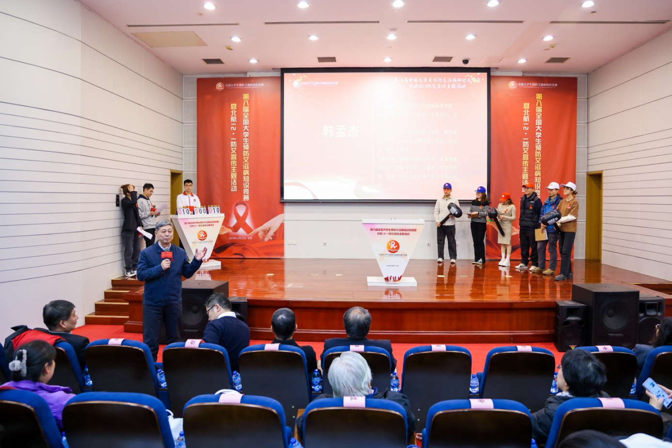 的大学生们进行的防艾知识竞赛活动。学生代表分为红白蓝三队参与竞赛,在知名主持人悦悦引导下,大学生积极参与,抢答现场气氛活跃。中国疾病预防控制中心专家对答题进行点评,并就相关防艾知识要点予以解答。