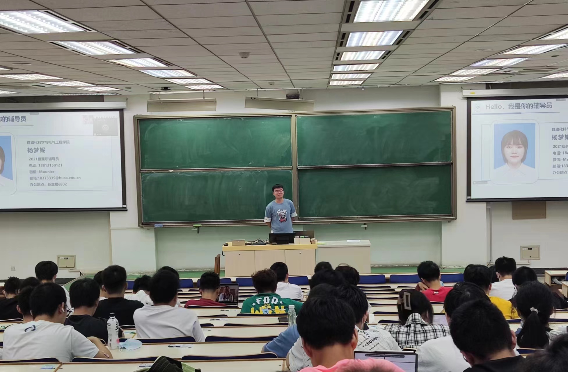 2021级本科生在主M102召开首次线下大班会,党委副书记贾子超,辅导员彭越、王鹏、杨梦妮参与了本次班会,本次会议由辅导员王鹏主持。