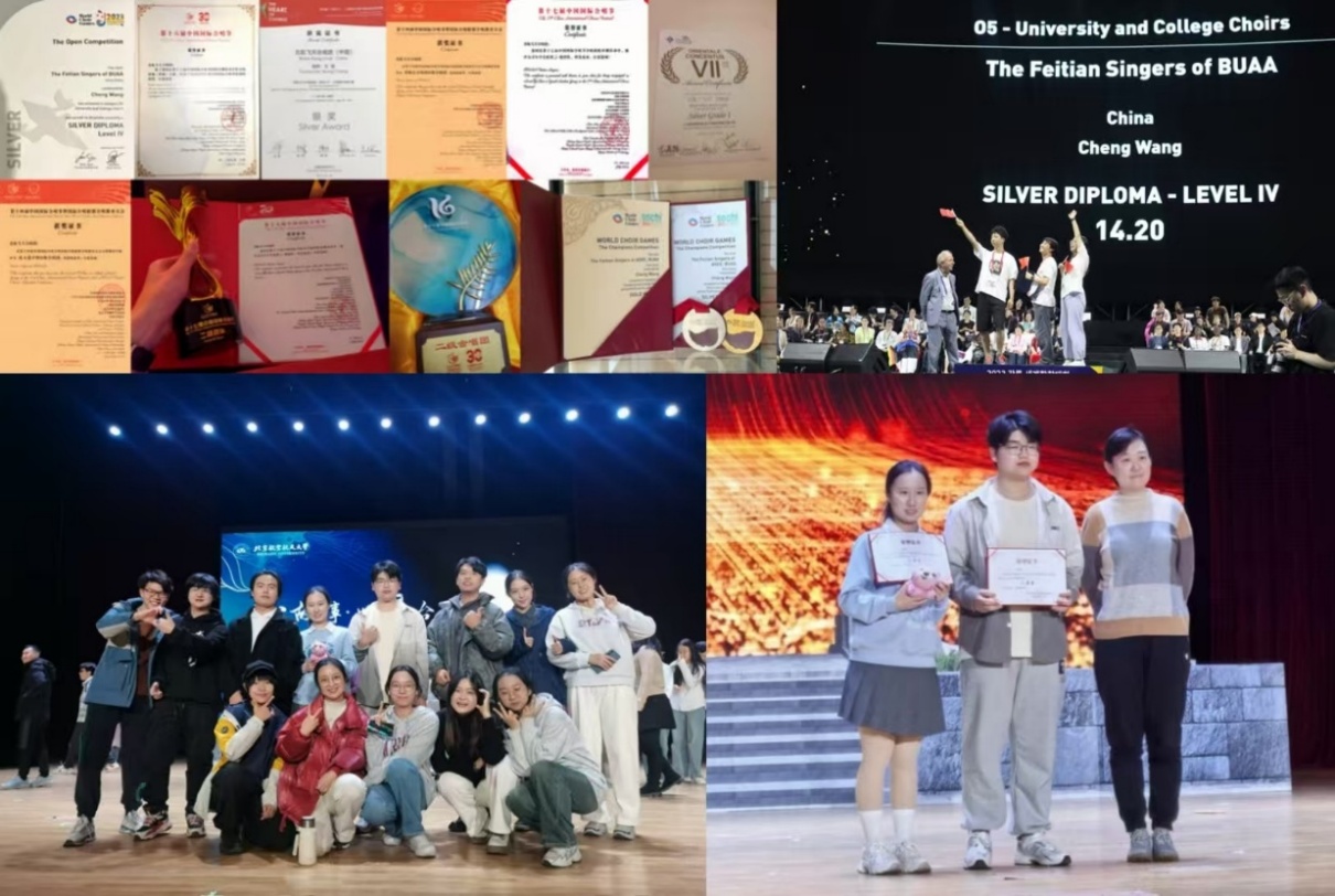 凭借深厚的艺术积淀与专业的指导支持,飞天艺术团在各类赛事中屡创佳绩:飞天合唱团先后斩获俄罗斯索契第九届世界合唱比赛高校组冠军赛金奖、韩国江陵第十二届世界合唱比赛银奖、第六届世界合唱比赛公开赛室内混声组银奖等国际大奖,多次在中国国际合唱节摘得金、银、铜奖,成为北航在国际合唱领域的一张“闪亮名片”;飞天话剧团荣获北京市大学生艺术展演二等奖、首都高校大学生心理健康节心理情景剧展演一等奖等荣誉,原创剧目《九九八十一难》在AG亚游